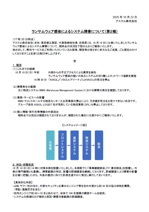アスクルより状況経過報告(第2報)の発表がありましたので、下記にお知らせさせていただきます。