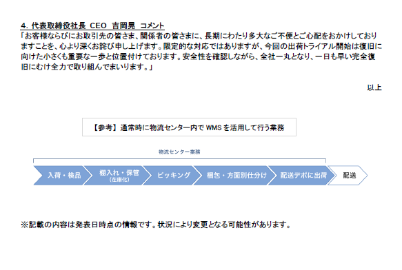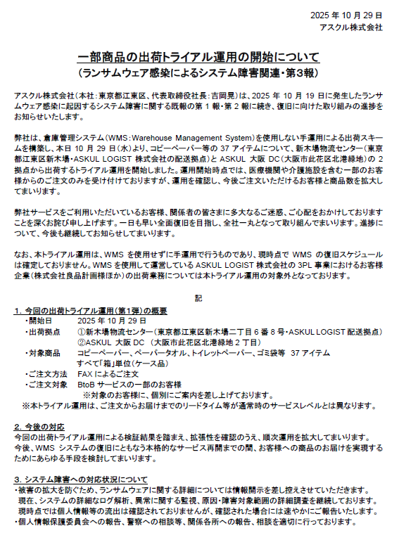 アスクルより状況経過報告(第3報)の発表がありましたので、下記にお知らせさせていただきます。