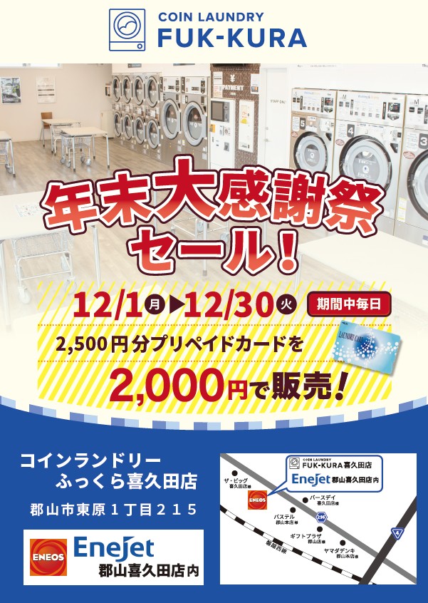 コインランドリーふっくら喜久田店より12月キャンペーンのご案内