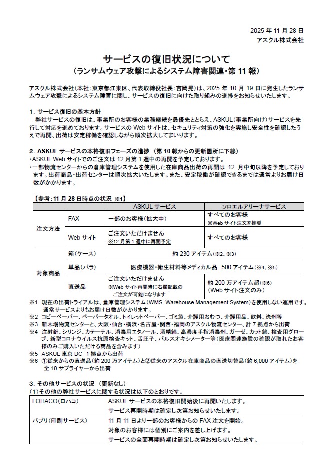 アスクルより状況経過報告(第11報)の発表がありましたので、下記にお知らせさせていただきます。