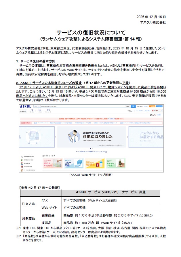 アスクルより状況経過報告(第14報)の発表がありましたので、下記にお知らせさせていただきます。