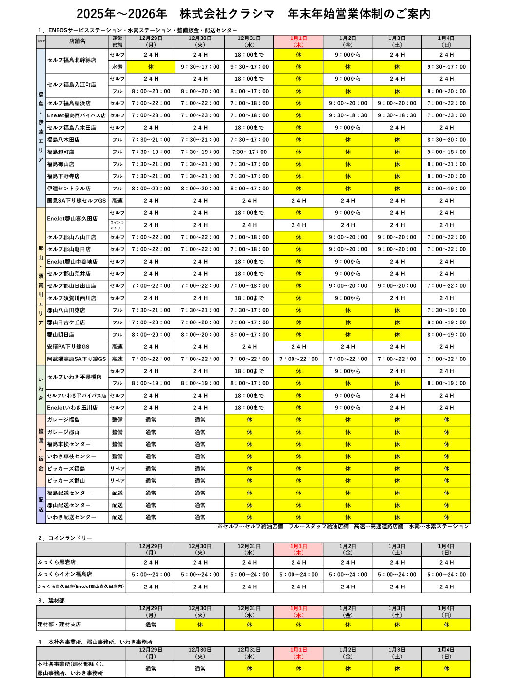 弊社店舗・各事業所の年末年始営業時間についてご案内申し上げます。下記よりご確認ください。