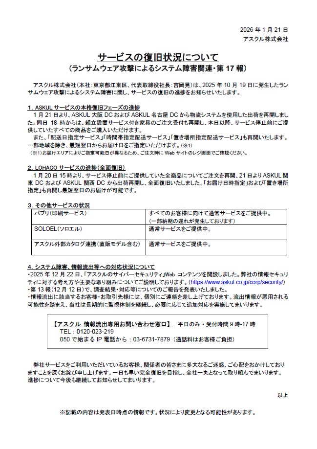アスクルより状況経過報告(第17報)の発表がありましたので、下記にお知らせさせていただきます。