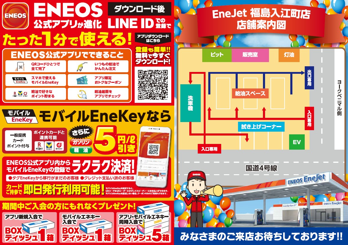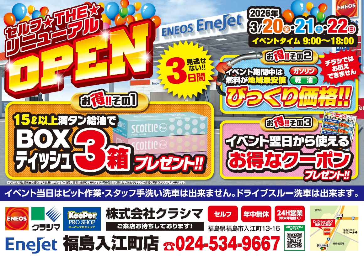 当社福島入江町店は、3月20日(金)~22日(日)の3日間、全面セルフへリニューアルを記念としてイベントを実施します。