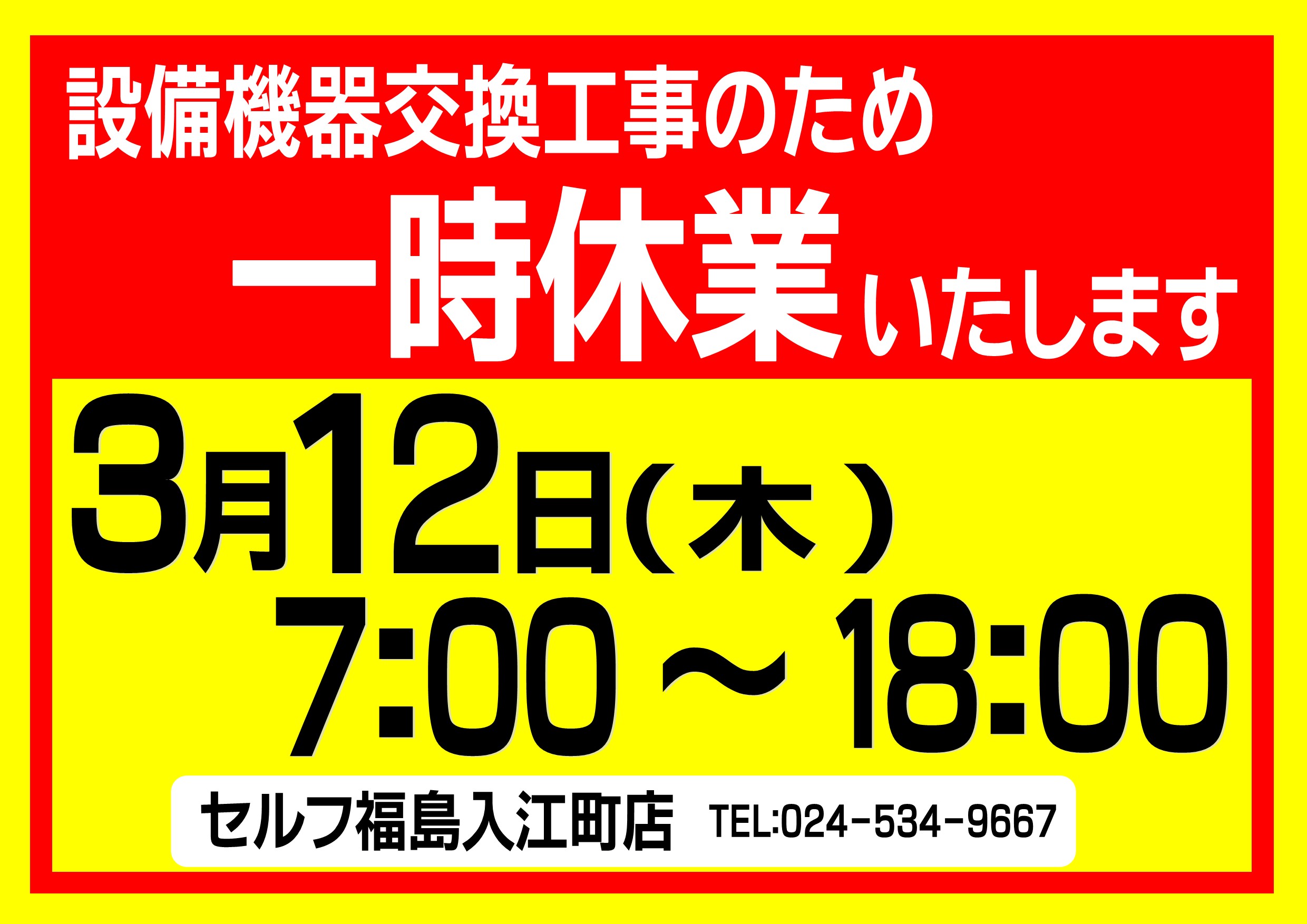 弊社福島入江町店は2026年3月12日(木)7:00~18:00、設備機器交換工事のため一時休業させていただきます。